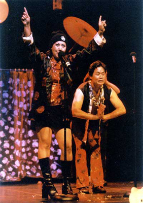 The use of the word chink, while controversial is intentionally political in its co-option of racist language to expose its negative impact on culture. Tongue in Cheek, the re-possession of language in this case begins with the etymology of the word chink, which is purportedly a diminutive for "Chinese" but as most asian Americans will tell you, Koreans, Thai people, Japanese people, Malaysians, Indonesians, Filipinos, and other members of the A/PI community have been potential targets for the word, which racistly assumes that all asian people are/look the same. Hence the cast of chink-o-rama is ethnically diverse and often of mixed race. Other words such as gook, nip, slant, etc are used in the show interchangeably as part of the whole disempowerment and relocation of the images associated with the words. Song Parody. Dance numbers. So say many pundits and comedy snobs. Kate's Chink-O-Rama is way more fun than an essay on semiotics. It asserts the right of Asian Americans to be visible in pop culture by re-placing traditionally "white/black/whateva" images from pop and hip hop, with amer-asian jokes and stories, hot asian fly girls and the powerful presence of Lady-K and MC Chink Daddy rocking the mic. Songs like the Charlie Chaniels Band doing "Devil Went down to Juilliard" and "Wok This Way" featuring asian chicks in blonde wigs lap dancing surprised audiences challenge assumptions about the martial artist/laundry boy/manicurist/masseuse/ping pong shooting/ delivery boy/ pidgin speakin/ Charlie Chan/ Suzy Wong/ math nerd/ blushing lotus petal that exists in the media's mail order mind.